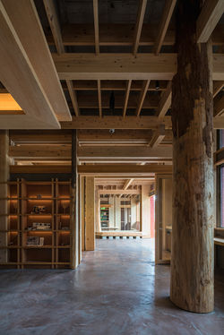 地下通路/コンコースからは駅舎から遠く霧島神宮本殿に向けて北東へ延びる軸を臨み、御神柱と呼ぶ幅1100mm×厚み330mmとなる大太鼓柱を駅舎の中心に据え、その大きさからRC部の耐震要素を兼ねさせた。駅舎内、東から西へ巨木の柱群は木造フレームがつくる4m×3.5mグリッドに徐々に合わせ配置され、同時に丸太状態から4面製材へと段階的に製材を施し、製材過程とその技術を見せている。駅舎全体を覆う38×235による井桁状の天井木架構は、ワークショップスペース、コンコース、待合へと積層数を徐々に増やしながら、体感的な天井高さが低くなり、深い森から外界となる街や斜面庭へ視線を導く構成とした。